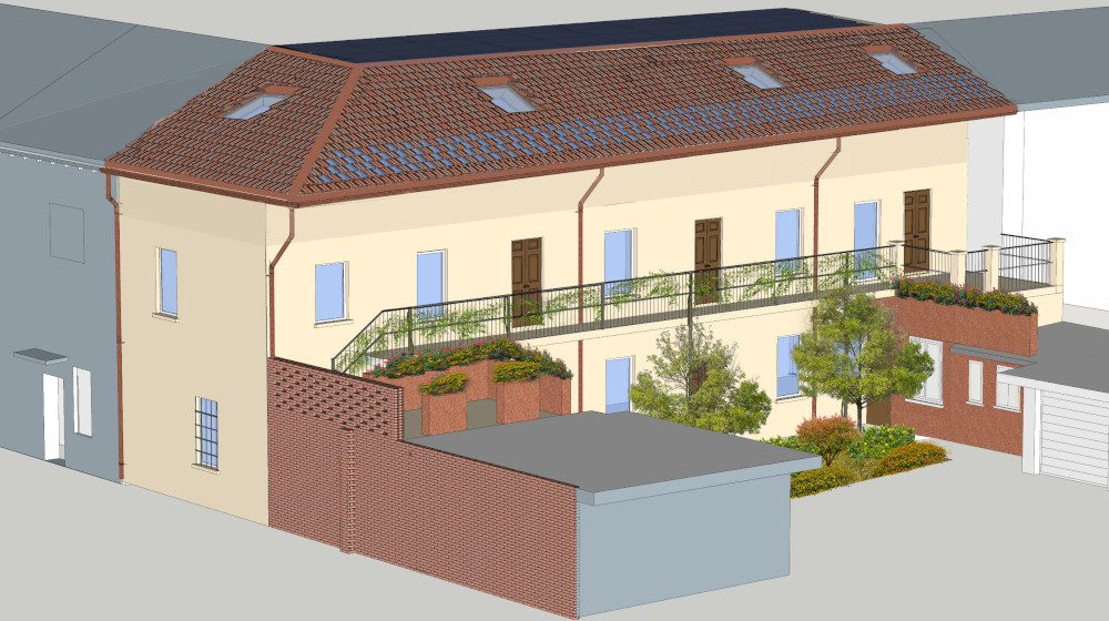 Impianto fotovoltaico: connesso, con accumulo e funzioni antiblackout. Trifase, fasi bilanciate su appartamenti e ufficio. Scambio (vendita e acquisto) con E-nostra. 10kwp di fotovoltaico sulla falda quasi piana, non visibile, inclinazione migliora la produzione malgrado orientamento nord-ovest. 11kwh accumulo per ottimizzazione dell'autoconsumo.